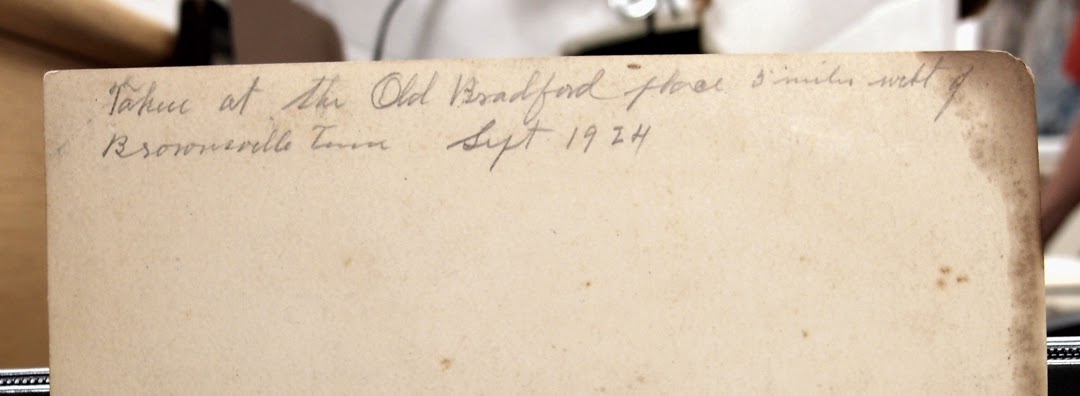 From what is written on the back, we know the photo was taken 90 years ago in September 1924 at “The Old Bradford Place” which was “five miles west of Brownsville.” These are very likely some of the descendents of Brownsville’s first entrepreneur, Hiram Bradford.