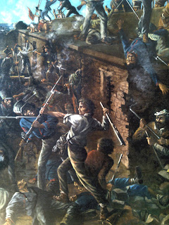 Anyway, our tour guide pointed out Davy Crockett who, in the mind of the artist, McArdle, didn’t let the fact he had run out of bullets stop him from attacking the enemy. He just beat them with the butt of his gun.