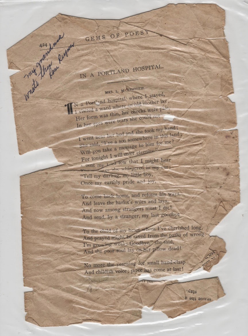 Lethie was also a poet as indicated by a note on a page taken from a book of poetry called “Gems of Poesy.” Michelle’s grandmother, Rose Reyner, wrote that her grandmother had written the poem.