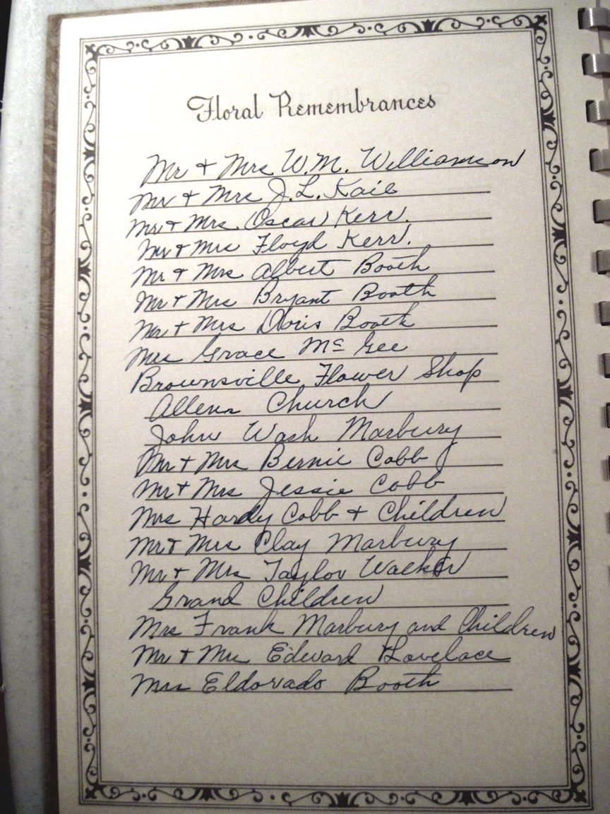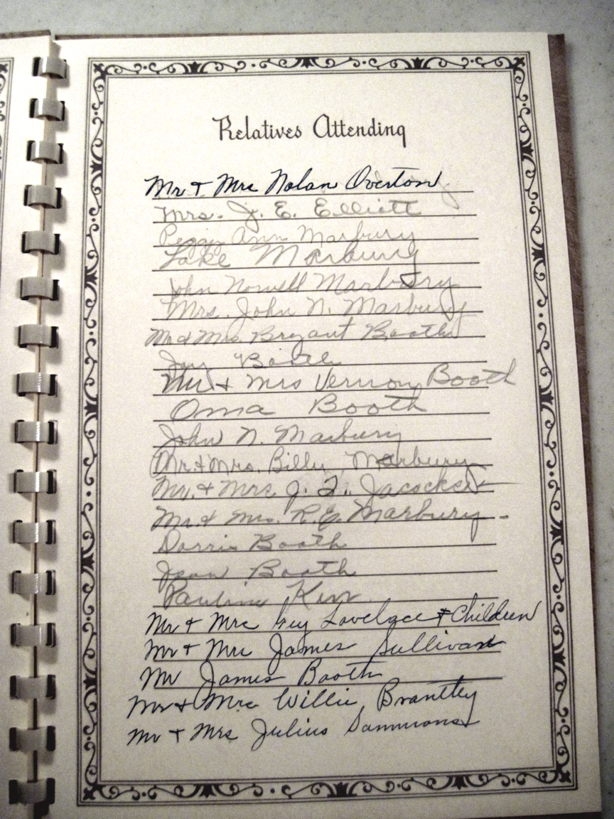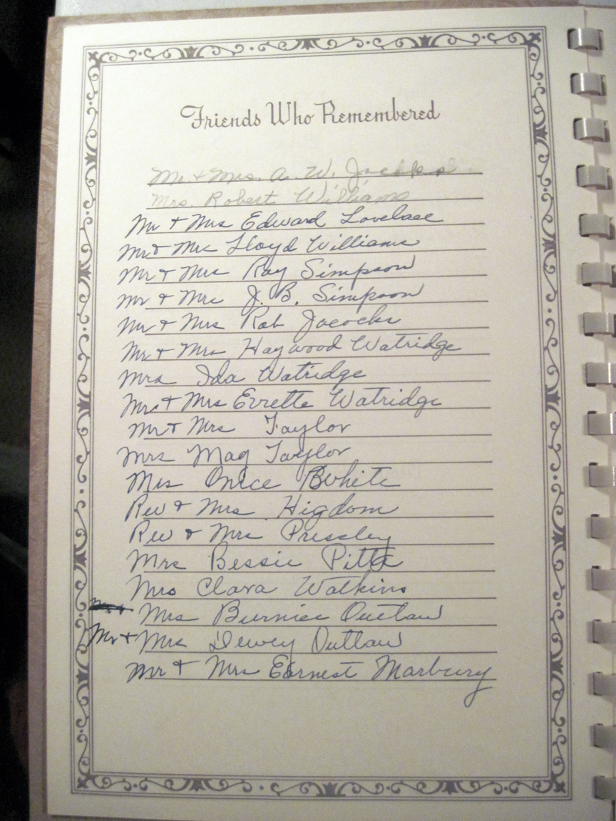 It only took a few minutes to find what I was looking for: the guest book from my second great grandmother’s funeral on October 8, 1949. Sarah Evelena “Lena” Booth Marbury was 81 when she died. Lena was my grandmother’s maternal grandmother. Lena’s daughter was Allie Marbury Brantley whose daughter was Virginia Brantley Lovelace whose daughter was Shirley Lovelace Williams who was my mother.